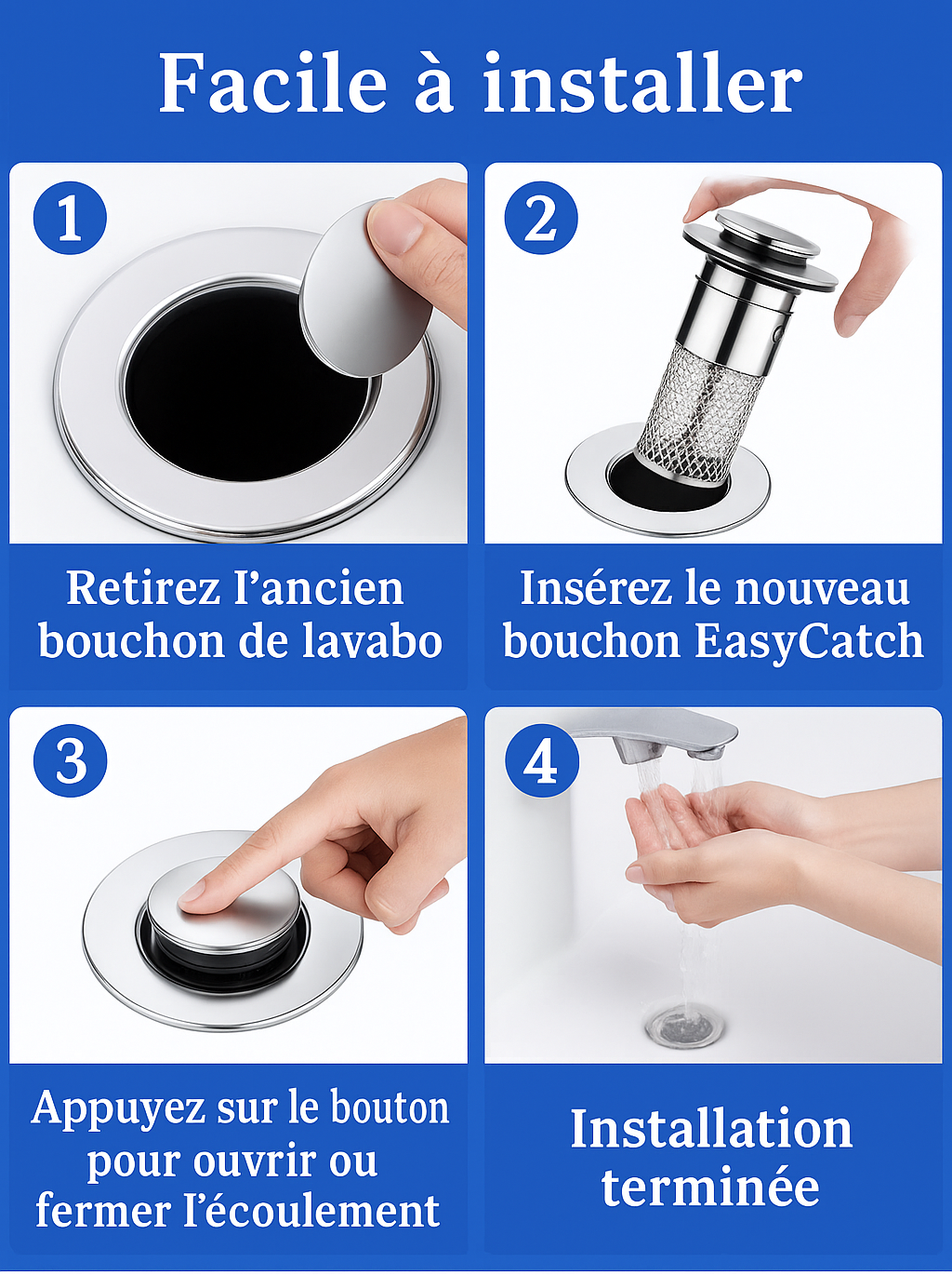 EasyCatch est conçu pour une installation simple et une utilisation pratique, ce qui le rend idéal pour tous les éviers de salle de bain, baignoires et éviers de cuisine.